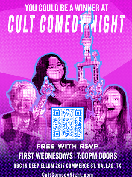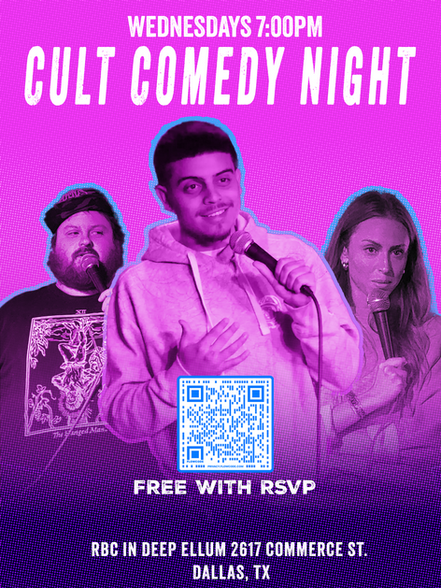 Cult Comedy Night is a monthly comedy variety show for new comedians and performers to practice material and show their talents. Shows include standup, improv, sketch, and music.